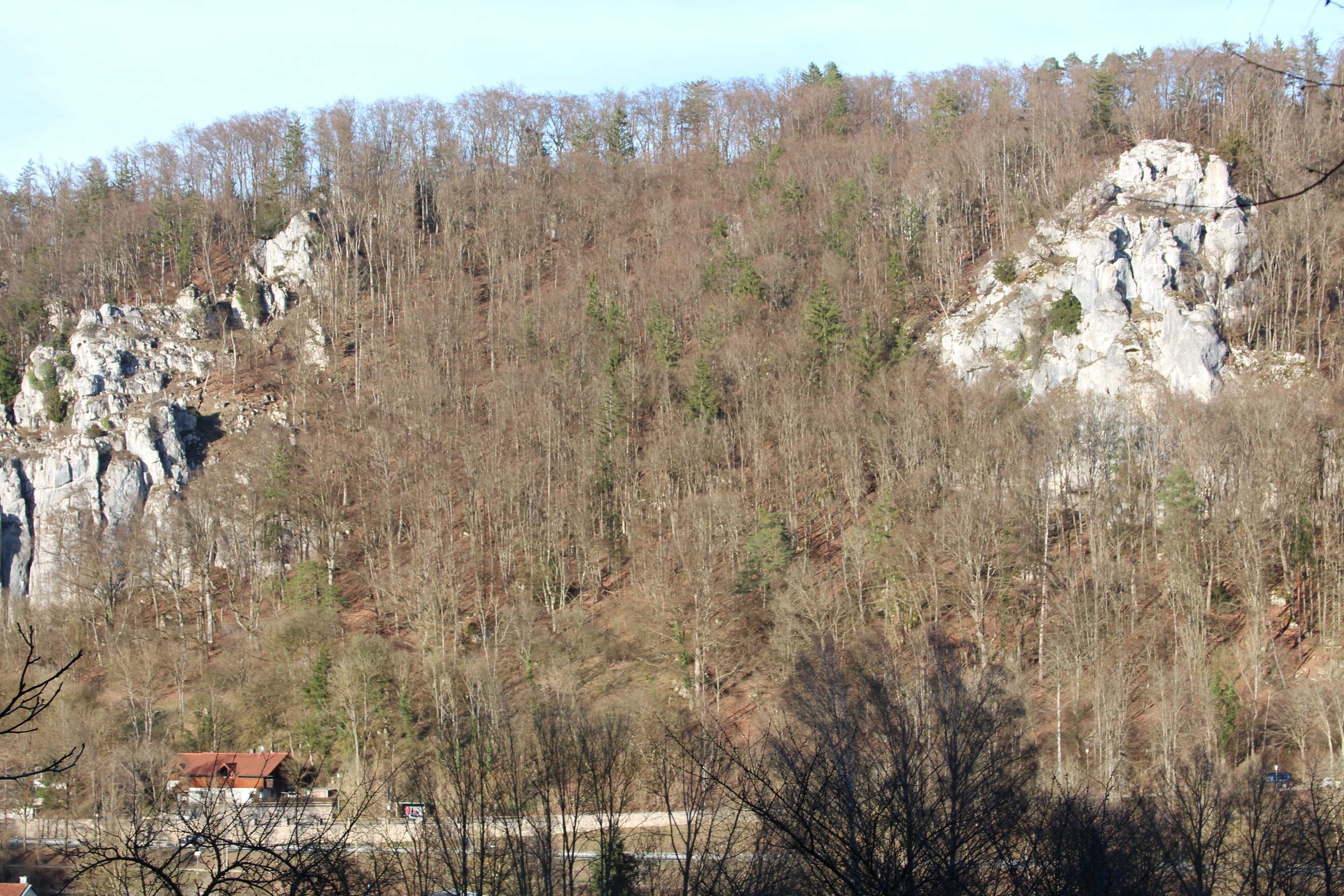 Der Hangwald im Besitz des BUND Naturschutz im Altmühltal bei Nusshausen. Er ist eingerahmt von Naturwald im Besitz des Forstbetriebs Kelheim und darf sich ungestört zur Waldwildnis entwickeln. In den Randbereichen erfolgt eine Verkehrssicherung (Nusshausen) und die Felsköpfe werden in größeren Abschnitten immer wieder freigestellt, um einem - durch die hohe Stickstofffracht aus der Luft - unnatürlichen Zuwachsen mit Gehölzen entgegenzuwirken. (Foto: Konrad Pöppel)