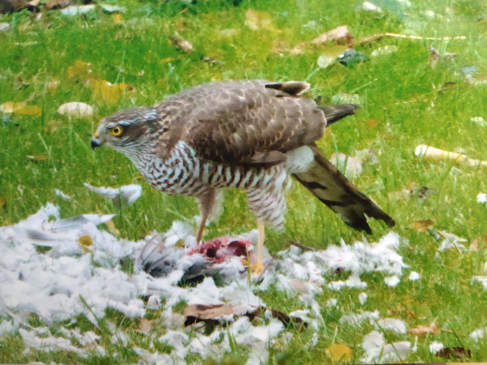 Im Garten von BN-Aktivist Sigbert Sieberichs hat ein Sperber-Weibchen im Oktober eine Taube erbeutet und genüsslich über mehr als eine Viertelstunde verzehrt. Dabei ließ sich die Sperber-Dame trotz Beobachtung aus dem Wintergarten nicht stören.