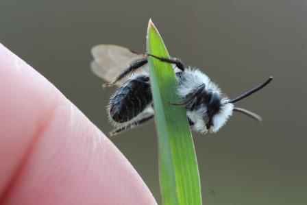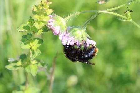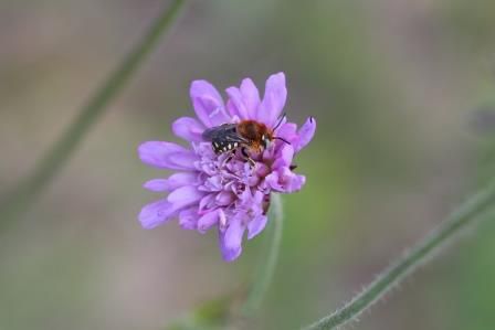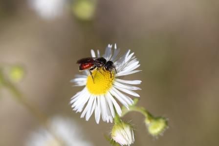 Aschgraue Sandbiene (Andrena Cineraria, m.) Konrad Pöppel Gewöhnliche Gold-Furchenbiene (Halictus tumulorum)) auf Feinstrahl. Konrad Pöppel Luzerne-Blattschneiderbiene (Megachile rotundata) an Acker-Hornklee (Lotus corniculatus). Konrad Pöppel Rote Mauerbiene (Osmia bicormis) an meinem Bienenhotel. Konrad Pöppel Rotschwarze Kuckuckshummel (Bombus rupestris) an Wiesen-Witwenblume. Diese Kuckuckshummel hat keine besonderen Lebensraumansprüche. Ihr Hauptwirt als parasitisch lebende Biene ist die Steinhummel, die auch in vielen verschiedenen Lebensräumen zu finden ist. Die Kuckuckshummelweibchen dringen in die Nester der Wirtshummel ein, zerstört die schon angelegten Brutzellen und legt ihrerseits Brutzellen mit eigenen Eiern an, die sie von den Arbeiterinnen des Wirtsvolkes versorgen lässt. Konrad Pöppel Blutbiene (Shecodes) auf Feinstrahl (Erigeron annuus). Blutbienen sind auch Brutparasiten. Sie dringen in die Nester anderer Bienen ein, brechen schon verschlossenen Brutzellenauf und töten Ei oder Larve. Dann legen sie ihr eigenes Ei und verschließen die Brutzelle wieder. Die später schlüpfende Larve der Blutbiene ernährt sich vom hinterlegten Pollenpaket der Wirtsbiene. Konrad Pöppel Weißfleckige Wollbiene (Anthidium punctatum, m.) auf Wiesen-Witwenblume (Knautia arvensis). Konrad Pöppel Garten-Wollbiene ((Anthidium manicatum) an Lavendel (Lavandula angustifolia) in einem sonnigen Heilkräutergarten; Konrad Pöppel